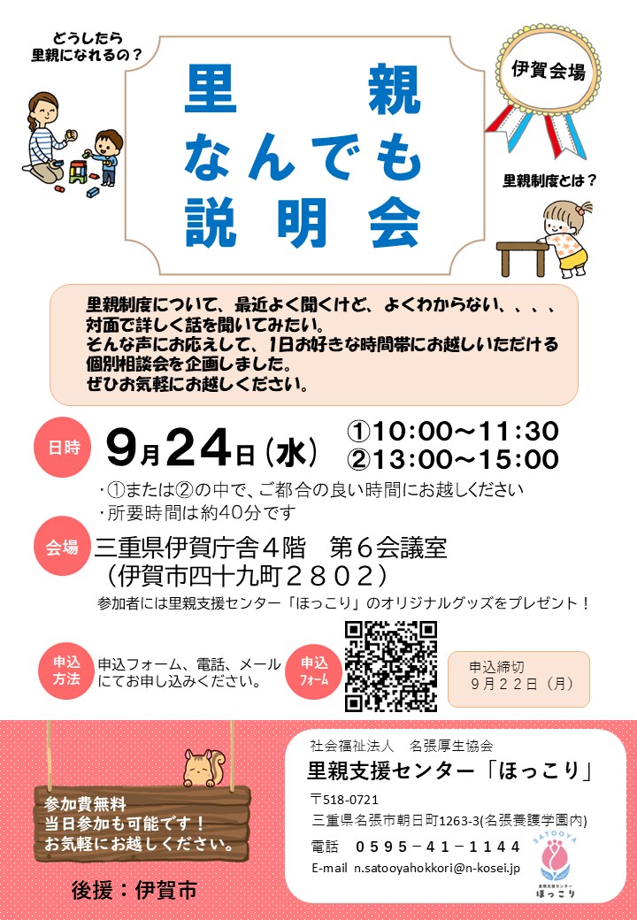 9月24日(水) に伊賀市の三重県伊賀庁舎4階 第6会議室にて、里親なんでも説明会を開催します。