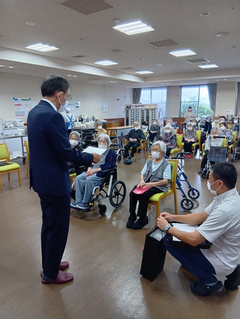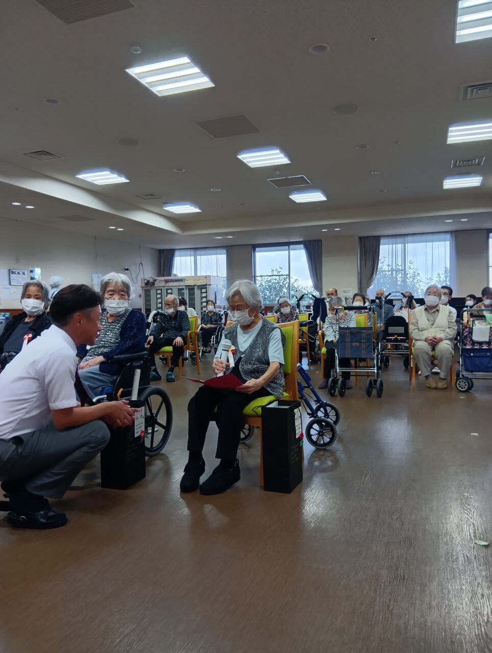 今年102歳をむかえられる入居者様が謝辞を述べられました。長生きの秘訣は「ご飯がおいしくいただけること」とおっしゃっていたのが印象的でした。