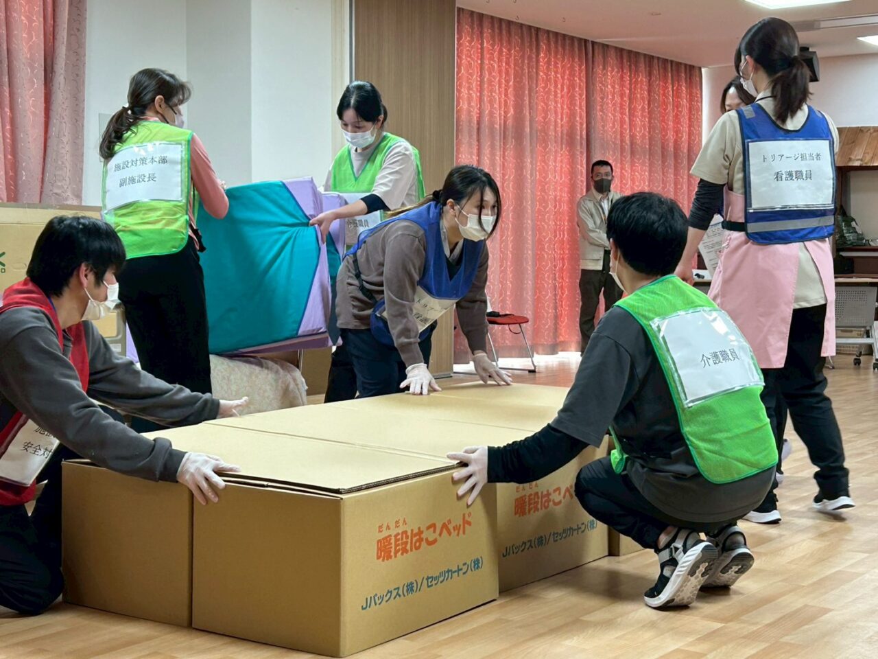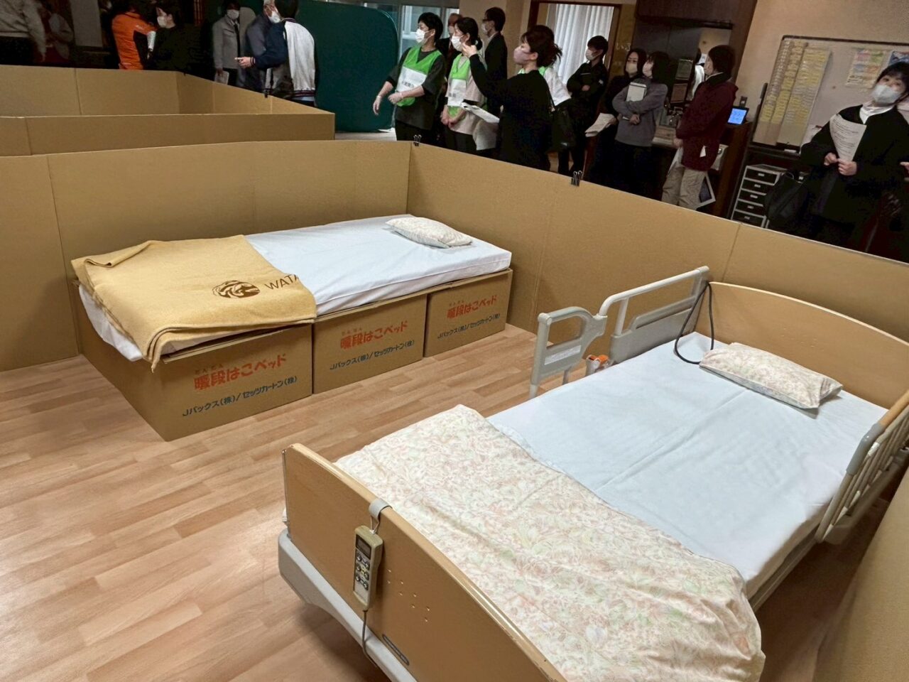名張市が用意してくれている、ダンボールベッドは、有事の際にはは支給してもらえる同タイプの物を配備してもらえているので、数の追加が起きても作り方は同じなので職員も助かります。