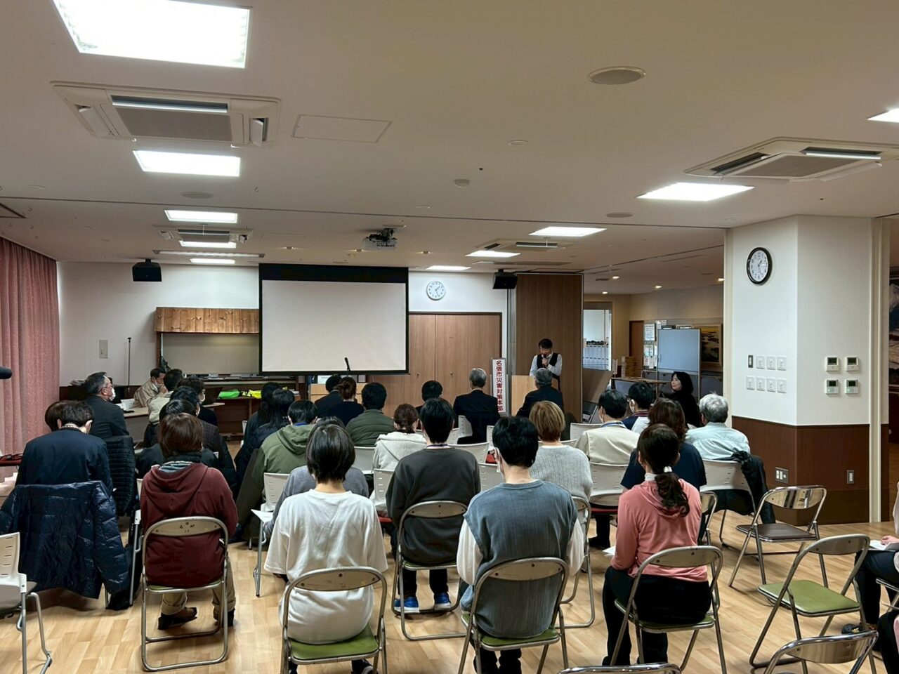 受け入れ訓練を終えた後は、同時刻に実施していた「美旗市民センター」での避難者受け入れ時の様子を動画で確認しました。「DWAT(災害派遣福祉チーム)」とのやり取りはとても勉強になりました。