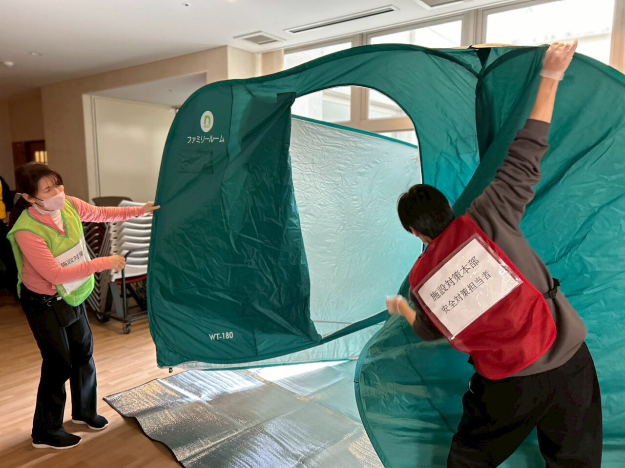 1階の広場で、「ダンボールベッド」「簡易ベッド」「生活スペースの仕切り」「ファミリーテント」などを広げて生活が出来る準備をしました。当施設には、すでに名張市より敷地内に「避難者用物品倉庫」を設置してくれており、倉庫の中には他にも「食料」「毛布」「簡易トイレ」「オムツ用品」など配備してもらえています。