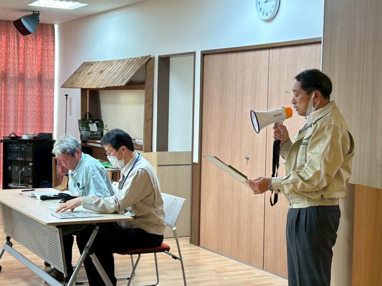 開催の挨拶後は、まずはじめに名張市危機管理室の伊藤様より「福祉避難所」についての概要説明をして頂きました。簡単に説明すると、福祉避難所とは災害が起きた時に一般の方々は、各地域に指定されている避難所(美旗周辺では、美旗市民センター)へ避難となりますが、介護が必要等の理由で福祉施設へ移送が必要と名張市が判断した場合に、当施設のような福祉施設で過ごしてもらえる施設のことを言います。今回は、①名張市 ②美旗市民センター ③名張特別養護老人ホーム で有事が起きた際の受け入れ状況の訓練を行いました。