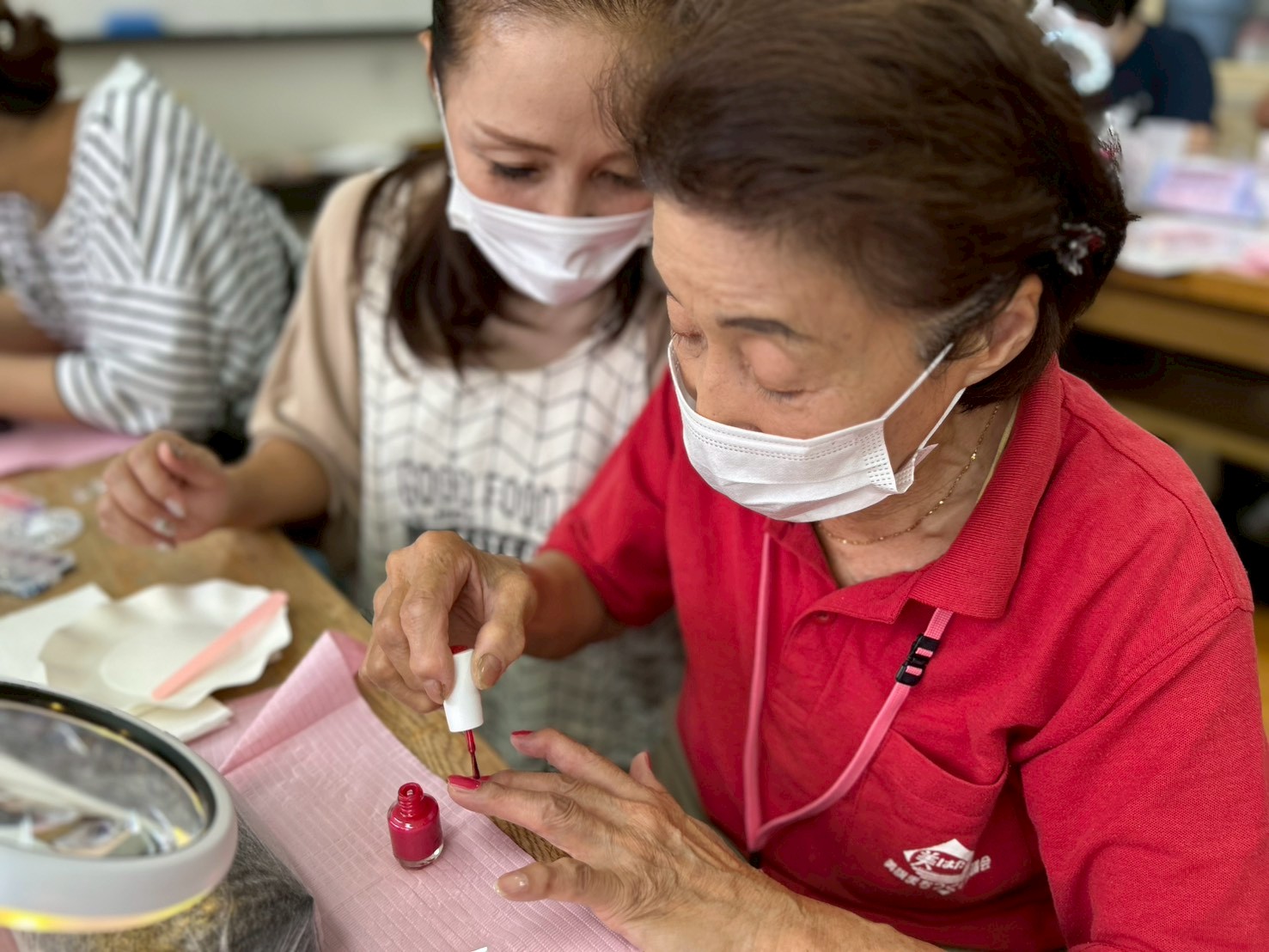 施設で取り入れている美容レクリエーションの体験として、ネイルでおしゃれを楽しんでもらいながら、ケア方法や健康との関わりについてお話しをさせていただきました。